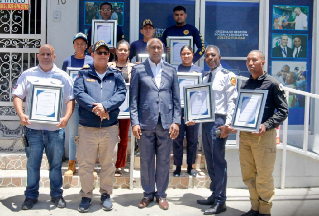 Baní, provincia Peravia. – El senador Julito Fulcar entregó este martes un reconocimiento especial a diez hombres y mujeres de la provincia Peravia que participaron en las labores de rescate y respuesta durante el colapso del techo de la discoteca Jet Set, ocurrido el pasado 8 de abril en Santo Domingo.